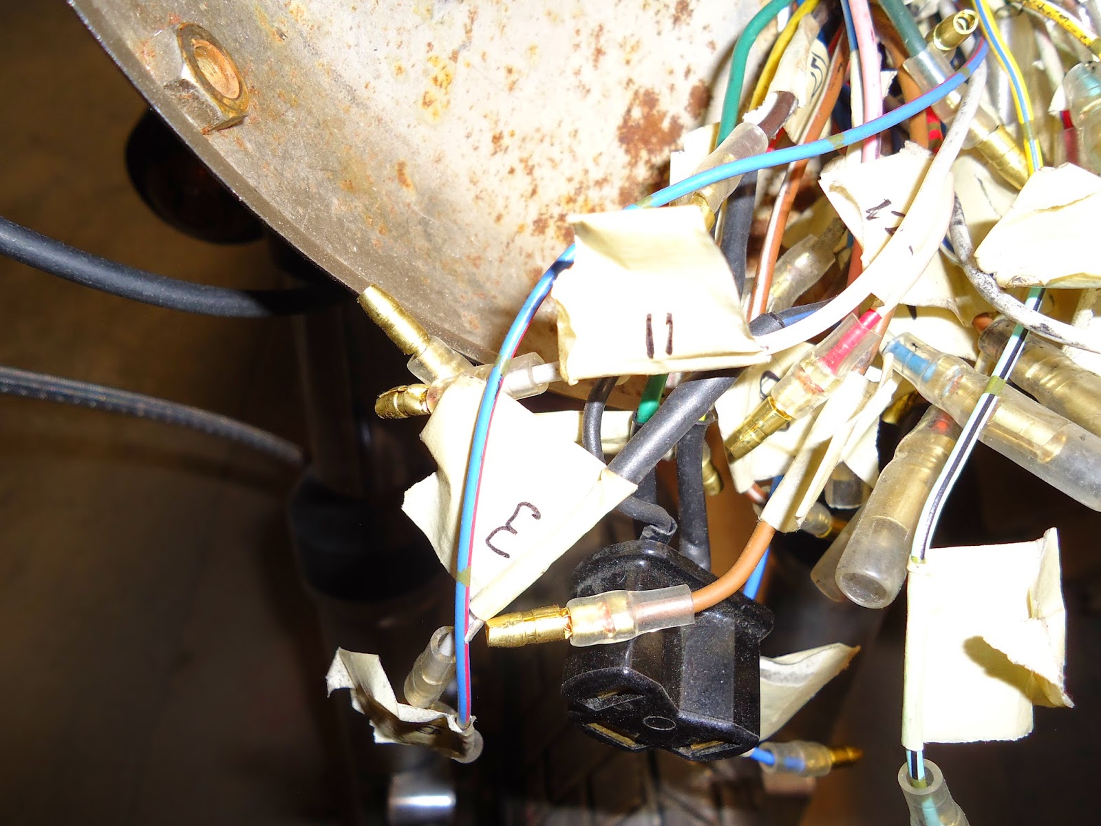 For the interim, the wires that are connected and housed in the headlight bezel were labelled with pieces of masking tape. Connected wires were numbered and then separated for painting and powder coating.